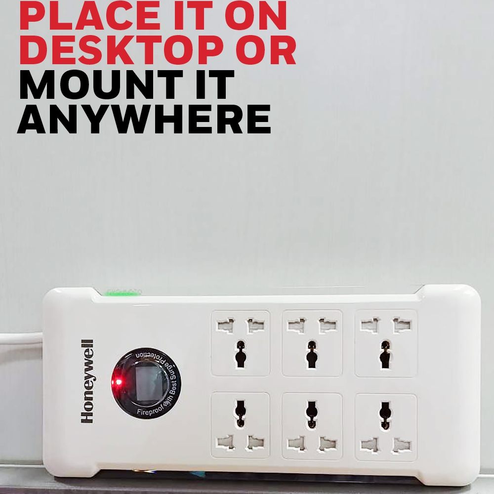 Protect your valuable electronics with the Honeywell 6 Socket Surge Protector. This advanced surge protector features a robust 918 Joules and 36,000 Amp surge protection, ensuring your devices are safe from power surges and spikes. Equipped with six opposite-facing sockets, two USB ports, and a master switch for added convenience, it also includes X3 Fireproof MOV technology, automatic overload protection, and an EMI/RFI noise filter. The 1.8-meter BIS-certified power cord ensures durability, and the sleek design complements any setup. Comes with a 3-year warranty and Device Secure Warranty up to ₹60,000/-.